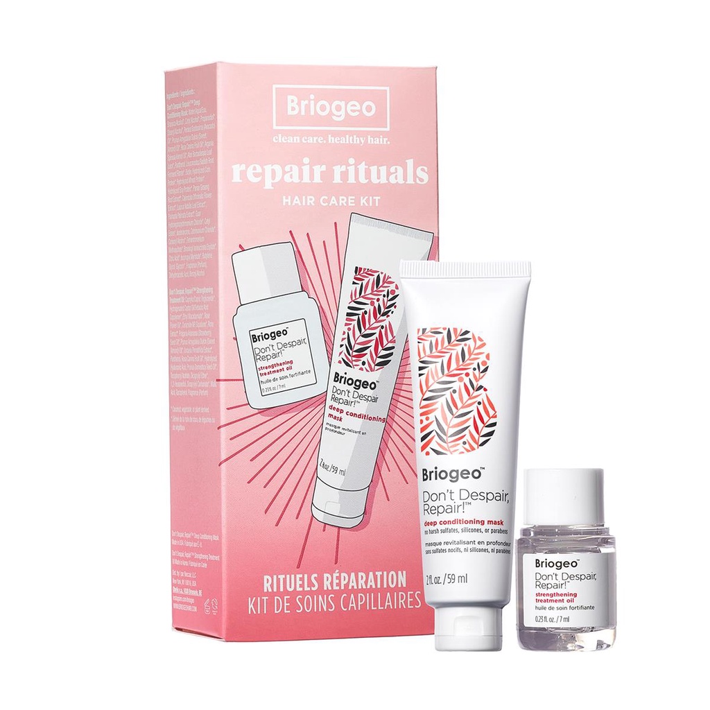 - Set Phục Hồi Tóc Hư Tổn Briogeo Don't Despair, Repair! Repair Rituals Hair Care Kit là 1 set gồm 2 món phục hồi tóc siêu đỉnh và đình đám của nhà Briogeo với nhiều công dụng, chúng ta hãy tìm hiểu từng sản phẩm một nhé.