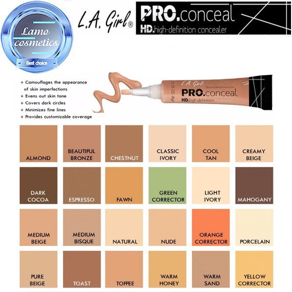 - L.A Girl Pro Conceal HD High Definition Concealer là che khuyết điểm dạng water base rất dễ tán đều trên da, chất kem có độ che phủ tài tình có thể che hoàn hảo các khuyết điểm nhỏ từ sẹo đến mụn, các vết thâm hoặc quầng thâm.