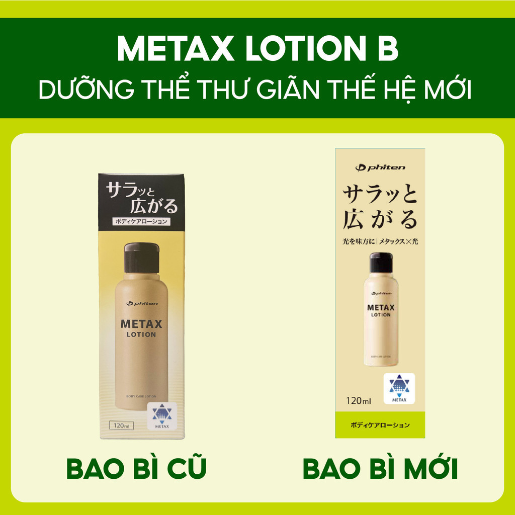 Phiten Metax Lotion B là một loại dưỡng thể thế hệ mới giúp thư giản cơ bắp tức thì. Metax Lotion được sử dụng phổ biến tại Nhật với mùi hương cam chanh sảng khoái. Sản phẩm đem lại lợi ích sức khoẻ cho từ vận động viên thể thao đến cuộc sống hằng ngày.