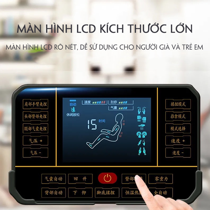 - Ghế được tích hợp 15 bài Massage tự động bao gồm các chế độ mạnh nhẹ. Không cần phải tao tác quá cầu kì, chỉ cần bật máy lên là bạn ngay lập tức có thể ngồi Massage. Điều này rất hữu ích cho người cao tuổi.