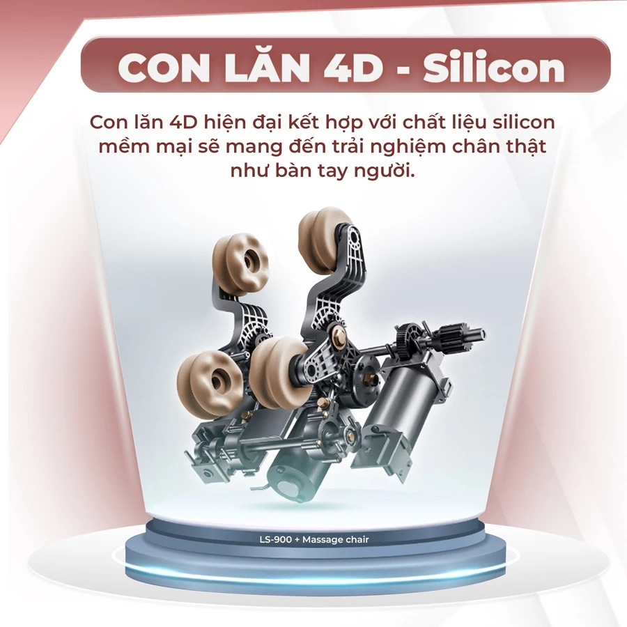 Con lăn 4D kết hợp với chất liệu Silicon mềm mại, mang đến trải nghiệm mát xa chân thật như ở spa. Đường ray SL dài 135cm, kéo dài từ cổ đến mông đem đến trải nghiệm mát xa toàn diện.