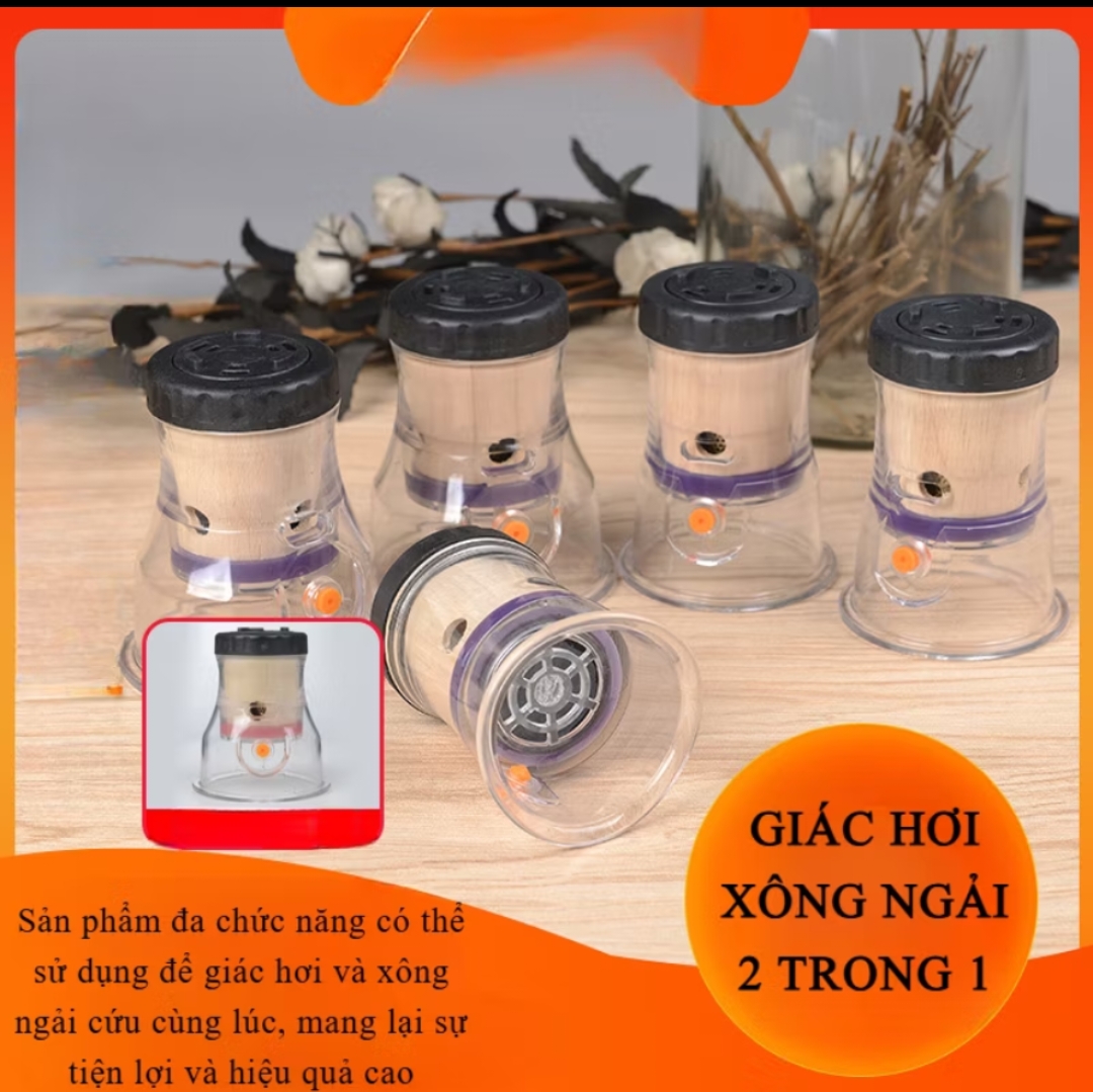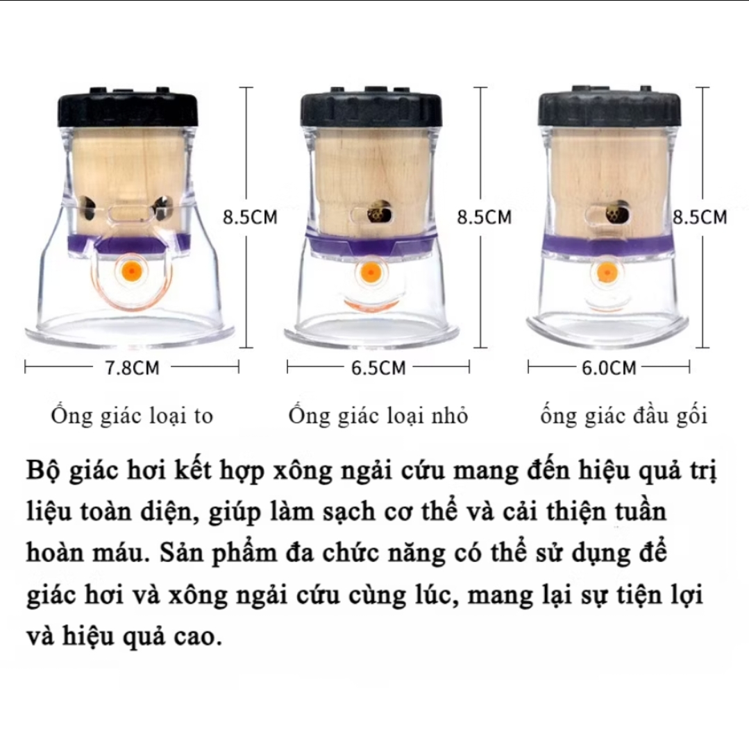 Bộ giác hơi ngải cứu cao cấp - VỪA GIÁC HƠI- VỪA CỨU NGẢICông dụng: ngải cứu+ giác hơi giúp ôn ấm và lưu thông khi huyết- Sản phẩm gồm 6 cốc giác hơi:   Số 1 DxR=8.5*7.8cm: 2 cốc  Số 2 DxR=8....