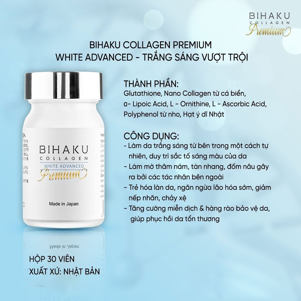 TPBVSK Bihaku Collagen Premium là sự kết hợp hoàn hảo của 7 hoạt chất làm trắng da, chống lão hóa được chiết xuất 100% tự nhiên. Sản phẩm giúp chống oxy hóa, cải thiện đàn hồi và độ ẩm cho da; Hỗ trợ cải thiện nếp nhăn, sạm da, giúp da sáng khỏe, mịn màng.