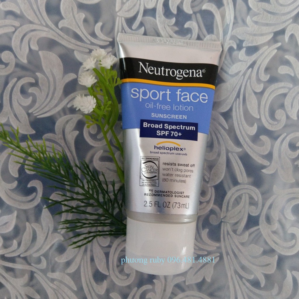 - Kem chống nắng Neutrogena Sport Face Oil Free Lotion SPF70 73ml với chỉ số chống nắng vượt trội bảo vệ da khỏi tác hại của tia UV chất kem mịn thấm nhanh, an toàn lành tính cho mọi loại da