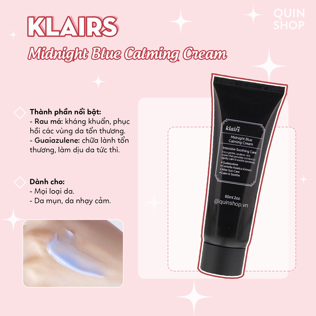Nếu các cậu đang tìm một loại kem dưỡng để "cứu" làn da sau khi dùng kem trộn, vừa đi nặn mụn, da yếu dễ mẫn cảm thì đừng bỏ qua Kem Dưỡng Da Klairs Midnight Blue Calming Cream này nhé!
