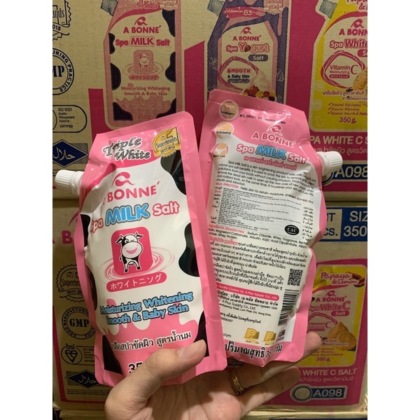 🛑 Muối sữa tắm A Bonne Spa Milk Salt (nhập khẩu từ Thái Lan) được bổ sung tinh chất từ sữa bò, yogurt, vitamin C nên độ an toàn cao, không lo da bị dị ứng. Muối tắm A Bonne Spa Milk Salt sẽ loại bỏ hẳn đi mối lo về mụn trứng cá ở lưng và bệnh viêm nang lông. Điều đặc biệt của muối tắm A Bonne Spa Milk Salt là chỉ cần tắm lại bằng nước sạch mà không cần dùng đến sản phẩm sữa tắm nào khác.
