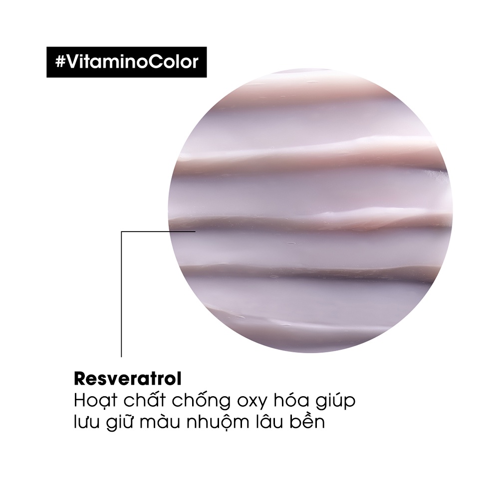 - Resveratrol trong mặt nạ Vitamino Color được chiết xuất từ vỏ trái nho là hợp chất thực vật giúp chống oxy hóa tốt nhất, giúp chống oxy hóa màu trên tóc nhuộm tốt hơn gấp 6 lần so với mặt nạ thường.