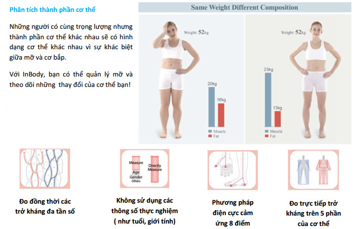 Giúp bạn phân tích thành phần của cơ thể; trọng lượng, mỡ cơ thể (phần trăm mỡ cơ thể), cơ bắp (khối lượng