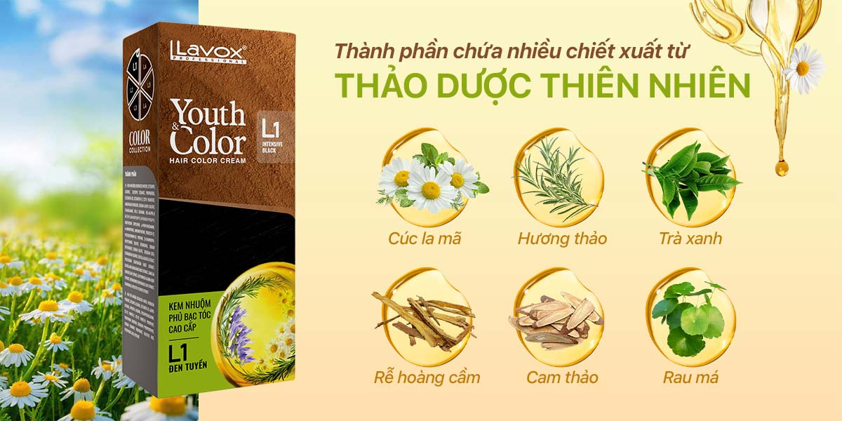 Với phương châm “không gây hại cho tóc & da đầu”, sản phẩm với các thành phần chứa nhiều chiết xuất từ thảo dược thiên nhiên: Rau má, rễ hà thủ ô, rễ hoàng cầm, trà xanh, cam thảo, hương thảo, cúc la mã giúp bảo vệ và nuôi dưỡng tóc từ gốc đến ngọn, giúp tóc luôn mềm mượt, không bị khô xơ và hư tổn sau khi nhuộm.