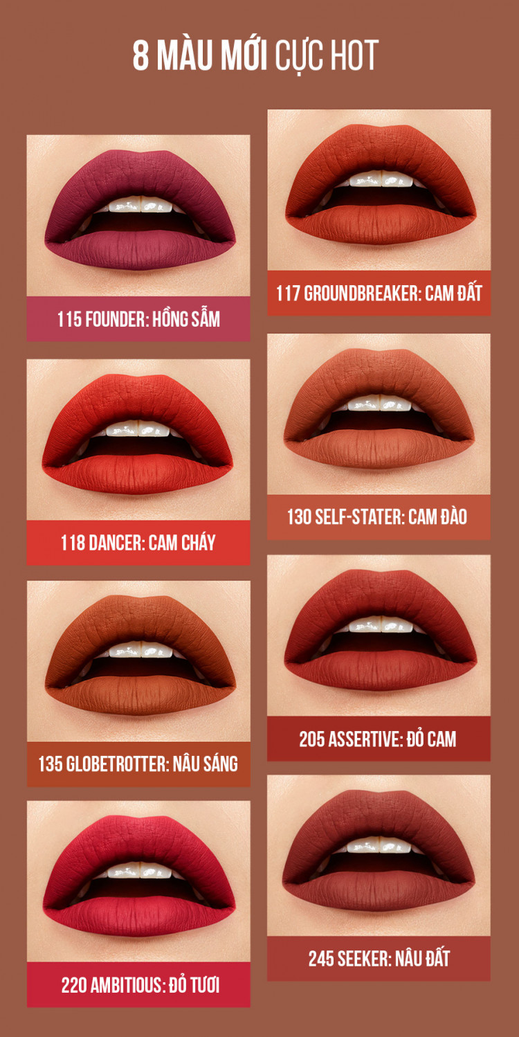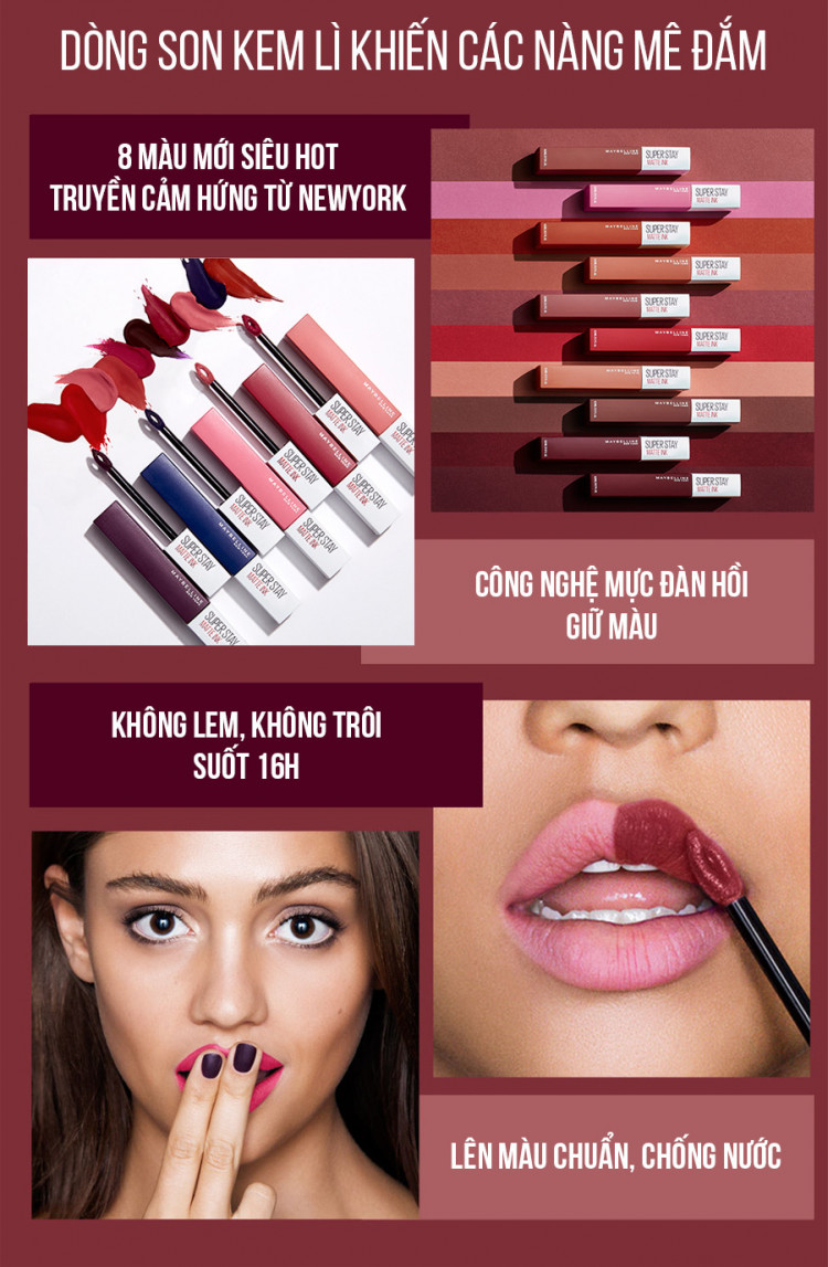 Son Kem lì Maybelline lâu trôi 16 tiếng Super Stay Matte Ink là sản phẩm cháy hàng tại nhiều quốc gia khác nhau, từ các quốc gia Châu Á như Philippines, Thái Lan… đến các nước châu Âu như Mỹ, Úc… với công nghệ mực đàn hồi độc quyền, không lem, không trôi suốt, giữ màu 16 tiếng, chất son kem lì vượt trội, nhiều màu phù hợp nhiều tone da, nay đã có mặt tại Việt Nam.