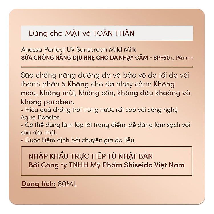 Giúp dưỡng da và bảo vệ da tối đa với thành phần tiêu chuẩn 5 không, dịu nhẹ và an toàn với làn da nhạy cảm nhất. Công nghệ Aqua Booster chống trôi trong nước và mồ hôi, bảo vệ toàn diện cho da kể cả khi bạn phải vận động, vui chơi nhiều ở ngoài trời và dưới nước. Sữa chống nắng rất thích hợp dùng cho cả mẹ và bé.