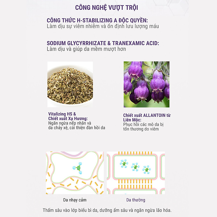 - Phức hợp H-Stabilzing A: Tăng cường hàng rào bảo vệ da và cung cấp độ ẩm