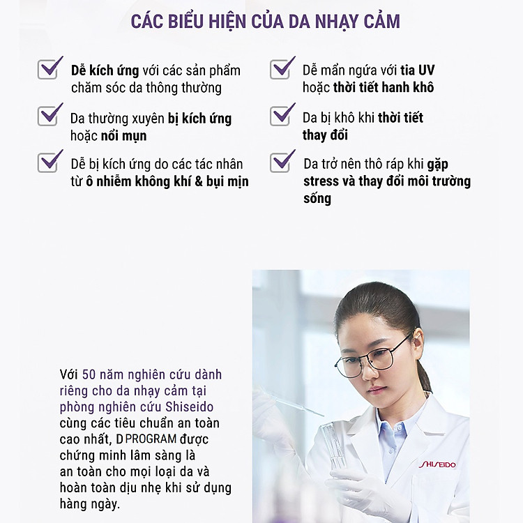 D PROGRAM Là thương hiệu dược mỹ phẩm cho da nhạy cảm, được nghiên cứu & phát triển từ Phòng nghiên cứu của tập đoàn Shiseido hơn 50 năm qua cùng với các tiêu chuẩn an toàn cao nhất và công nghệ vượt trội dành riêng cho từng tình trạng da. Các sản phẩm của D PROGRAM có công thức không gây kích ứng đã được kiểm nghiệm dị ứng áp da trên 1800 phụ nữ Châu Á có làn da nhạy cảm. D PROGRAM với tác động “kép” giúp bảo vệ & nuôi dưỡng làn da nhạy cảm trở nên khỏe mạnh & đẹp rạng rỡ như mong ước dành riêng cho phụ nữ Á Đông.