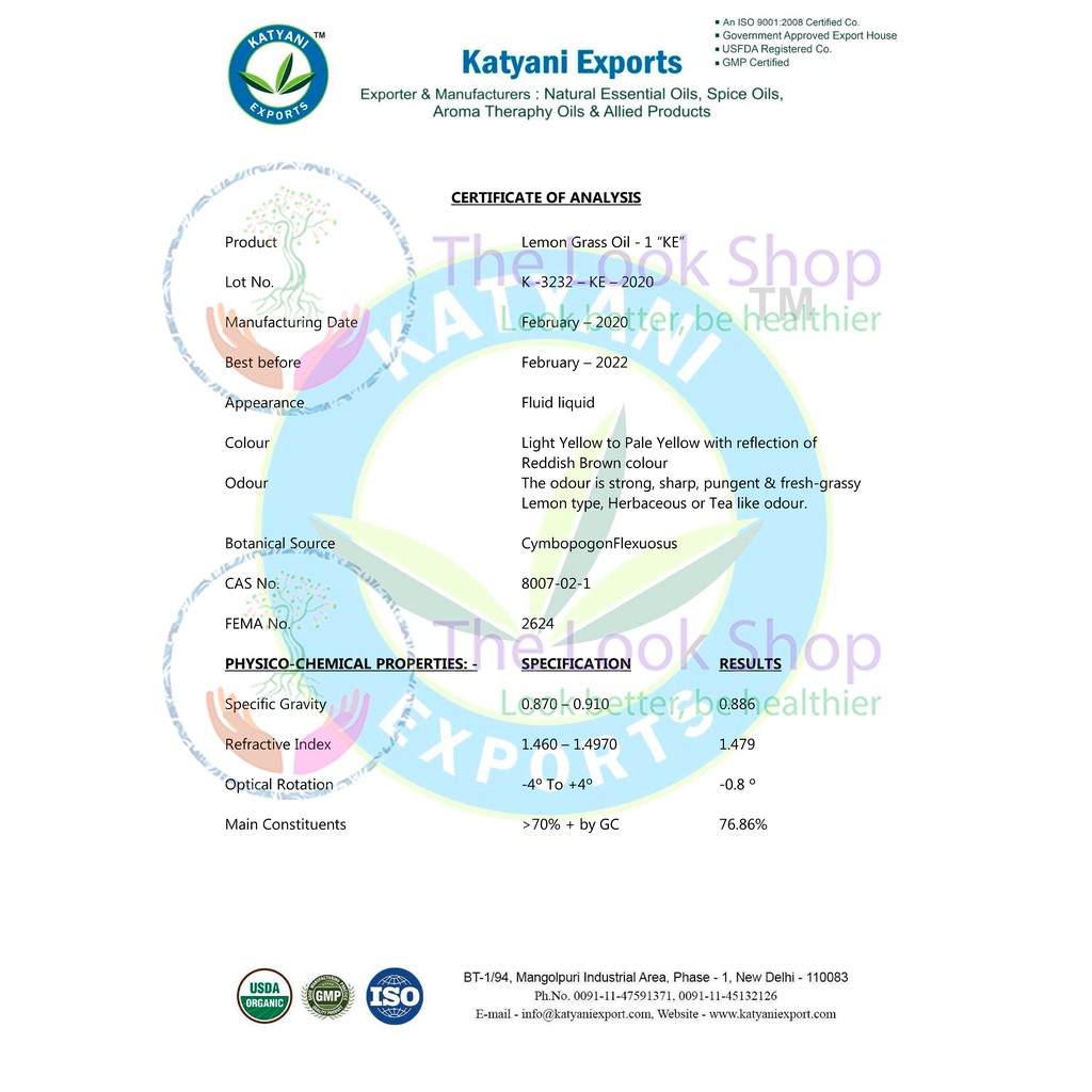 -Tinh dầu Sả chanh Lemongrass Essential Oil Fresh Look- size10ml: với nguồn nguyên liệu được nhập khẩu chính ngạch từ Ấn Độ, vương quốc của thảo dược, có giấy kiểm định chất lượng như hình đính kèm. Tinh dầu Fresh Look thuộc dòng sản phẩm tinh dầu được The Look Shop nhập khẩu và đóng gói trong chai thủy tinh 10ml giúp mang lại sản phẩm chất lượng nhất đến tay người tiêu dùng với giá thành hợp lý nhất.