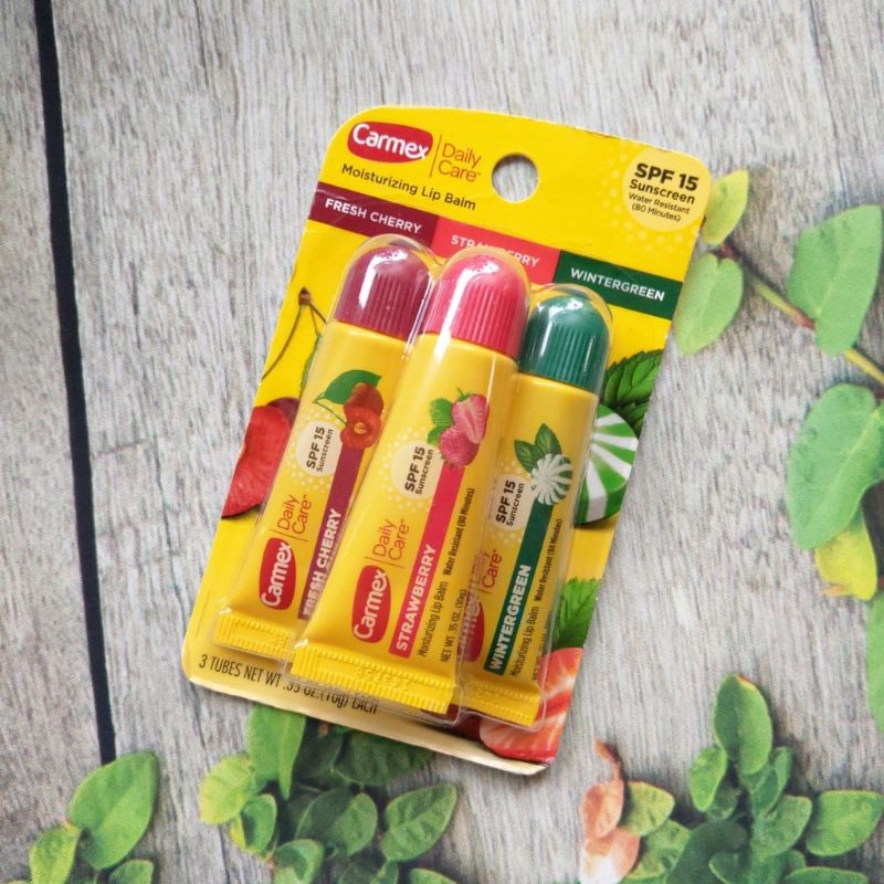set 3 thỏi 4.25g tuýt hoặc thỏi với 3 mùi trái cây . Son dưỡng còn có chống nắng SPF15